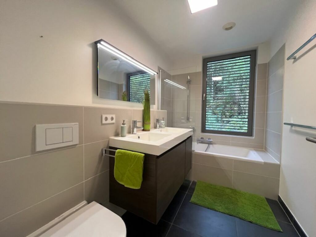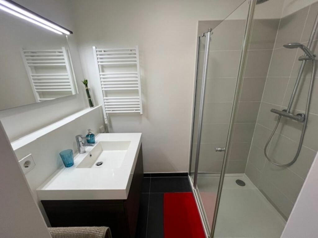 Quant aux salles de bains, sachez seulement qu’une est pourvue d’une baignoire et l’autre d’une cabine-douche. Côté pratique, les lavabos sont encastrés dans un joli meuble. Le WC est séparé.