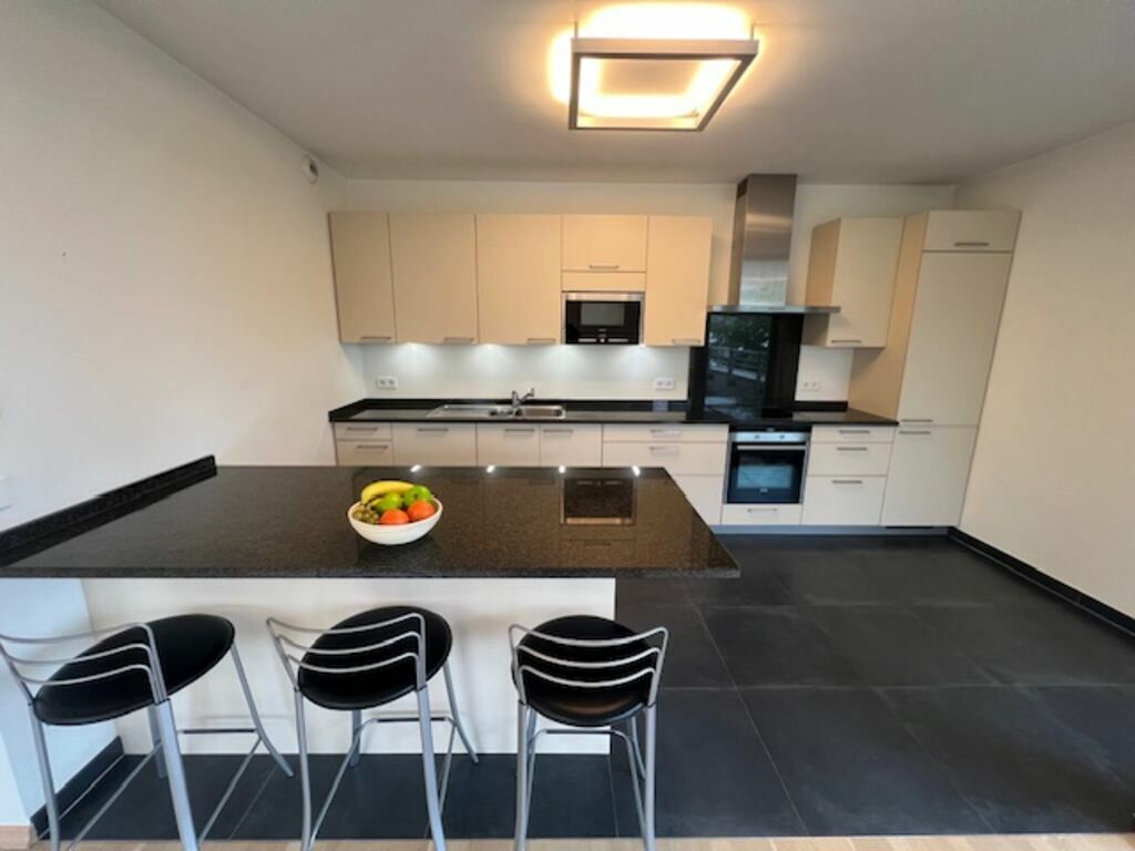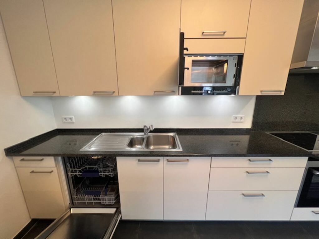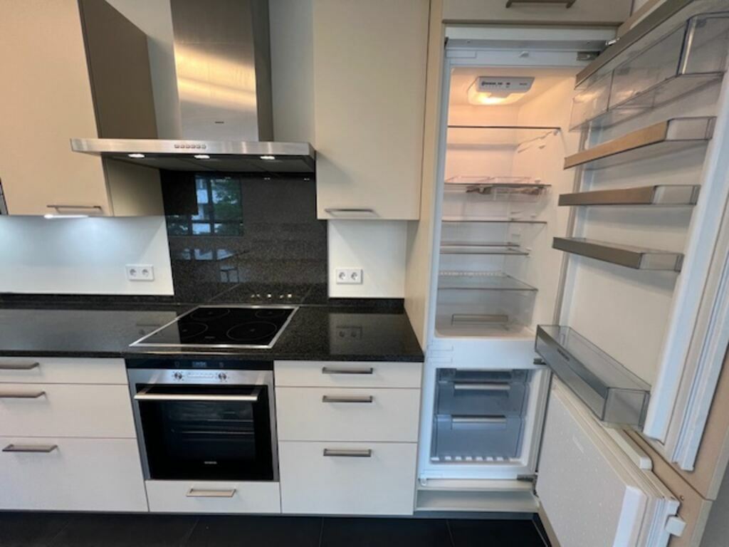 Pour ce qui est de la cuisine (12,20 m2) [4,6 X 2,6], comme vous pourrez aussi le voir sur une des photos, elle est très bien équipée, plus que standard même. Par exemple, vous avez en plus du réfrigérateur un congélateur séparé (avec 3 bacs), un four + un micro-ondes séparé (très rare), une plaque de cuisson vitro-céramique avec sa hotte au-dessus, un lave-vaisselle, … (Notez par ailleurs que le plan de travail est en granit.)
