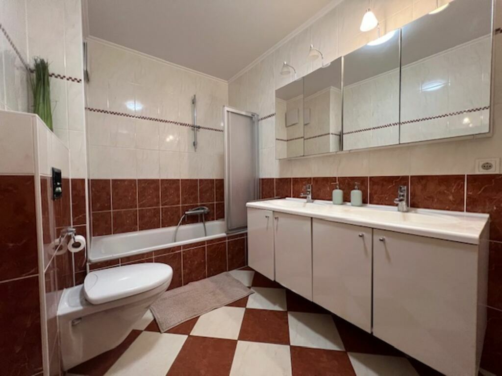 La salle de bains (5,90 m2) comprend une baignoire (avec une paroi douche), deux lavabos encastrés dans un meuble et un WC. Côté pratique, la salle de bains comprend un raccordement d’eau afin que vous puissiez y installer votre lave-linge.
