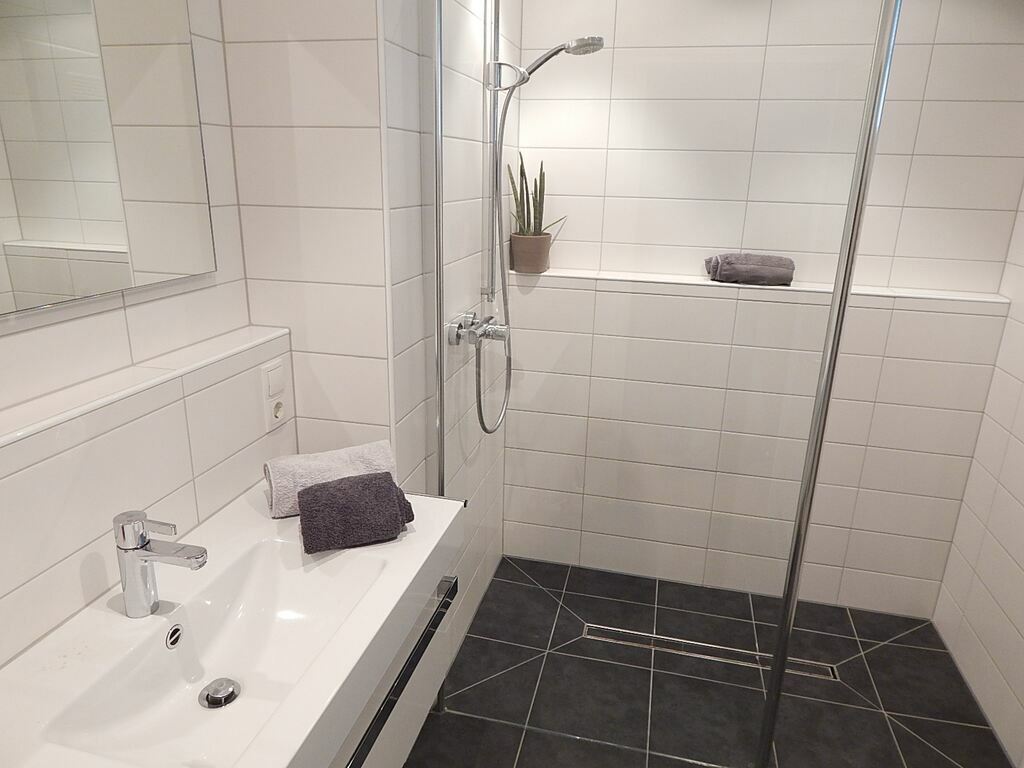 Quant à la salle de bains (ou pour être plus précis, salle de douches), elle comprend une douche dite «à l’italienne», un lavabo encastré dans un joli meuble et ainsi qu’une grande armoire (très pratique pour le rangement des serviettes et autres objets). Le WC est quant à lui séparé.