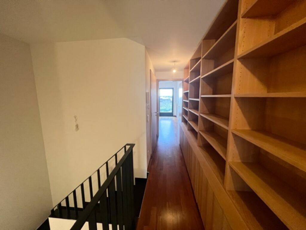 Maintenant que la visite de la partie basse du duplex est terminée, montons à l’étage (où se trouve les deux chambres à coucher, la salle de bains, la bibliothèque et ainsi qu’un débarras avec raccordement d’eau pour votre lave-linge).